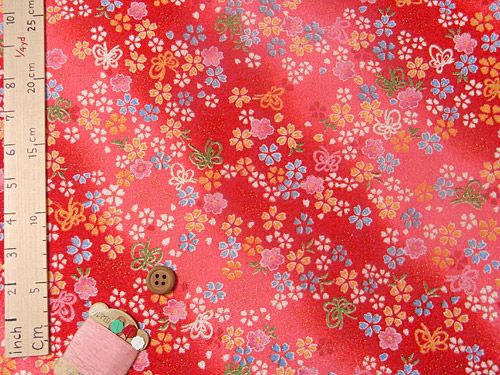 ちりめん生地・桜とリボン蝶(赤) 10cm単位 切り売り
