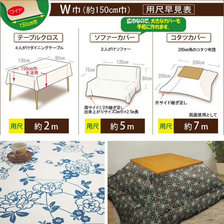 約150cmの広幅生地で適度な厚みとこしがあるので、インテリア用途に最適。テーブルクロス、クッションカバー、間仕切りカーテンなどに。もちろん、洋服やエプロン、バッグ作りにも使えます。