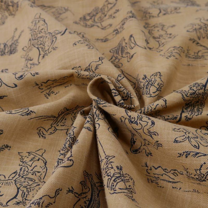 国宝の鳥獣戯画柄、ムラ糸の素朴な生地 和柄コットン生地・鳥獣人物戯画(紺) 10cm単位 切り売り
