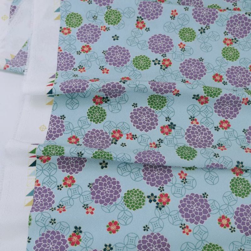 衣装にもおすすめ!洗濯OKのちりめん ポリちりめん生地 七宝に春秋花(水色) 10cm単位 切り売り
