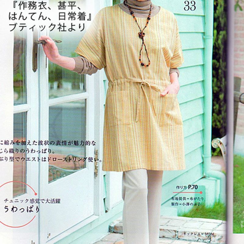 この布地は太さの異なる糸を織り込むことで、微妙な凹凸を出しています。一般の平織り生地とは違う風合いで、素朴でナチュラルな雰囲気を見せます。