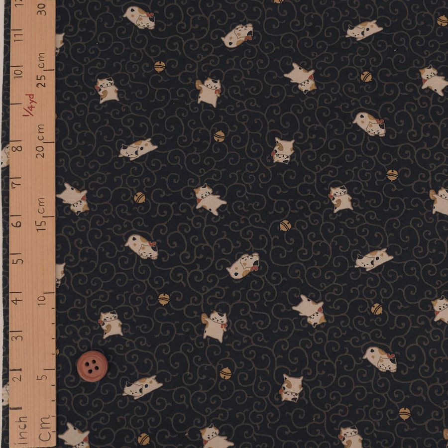和柄コットン生地 唐草にのんびり猫(黒) 10cm単位 切り売り