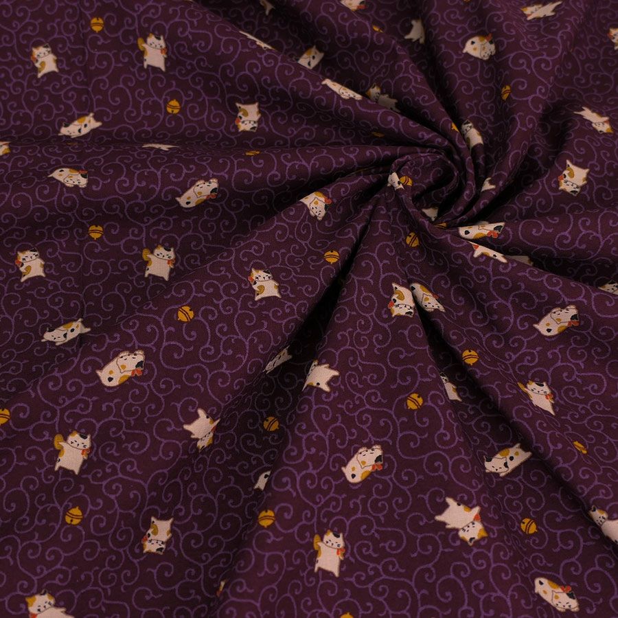 和柄コットン生地 唐草にのんびり猫(紫) 10cm単位 切り売り