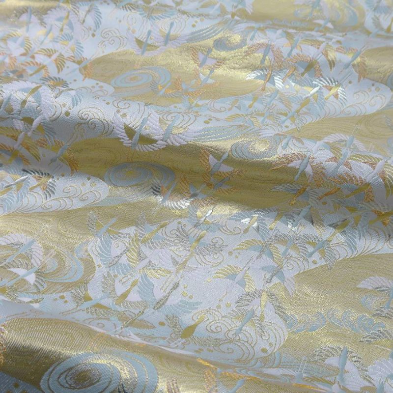 商品案内多数の鶴が舞う様子が全面に織り出された、おめでたい絵柄の西陣織金襴。品のある控えめな豪華さが素敵です。