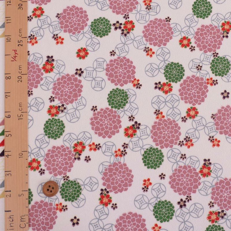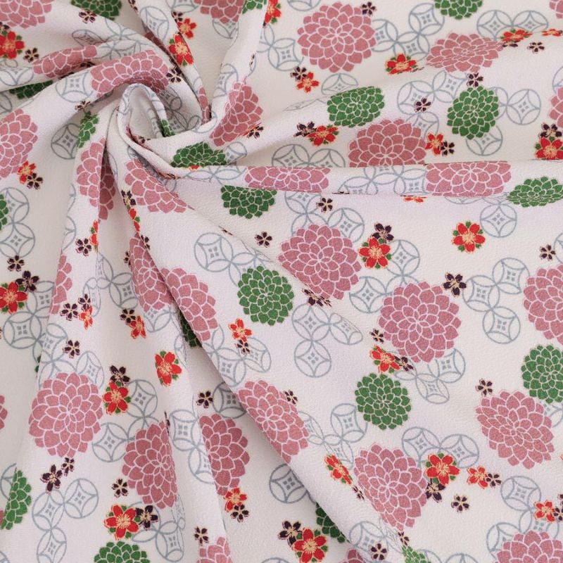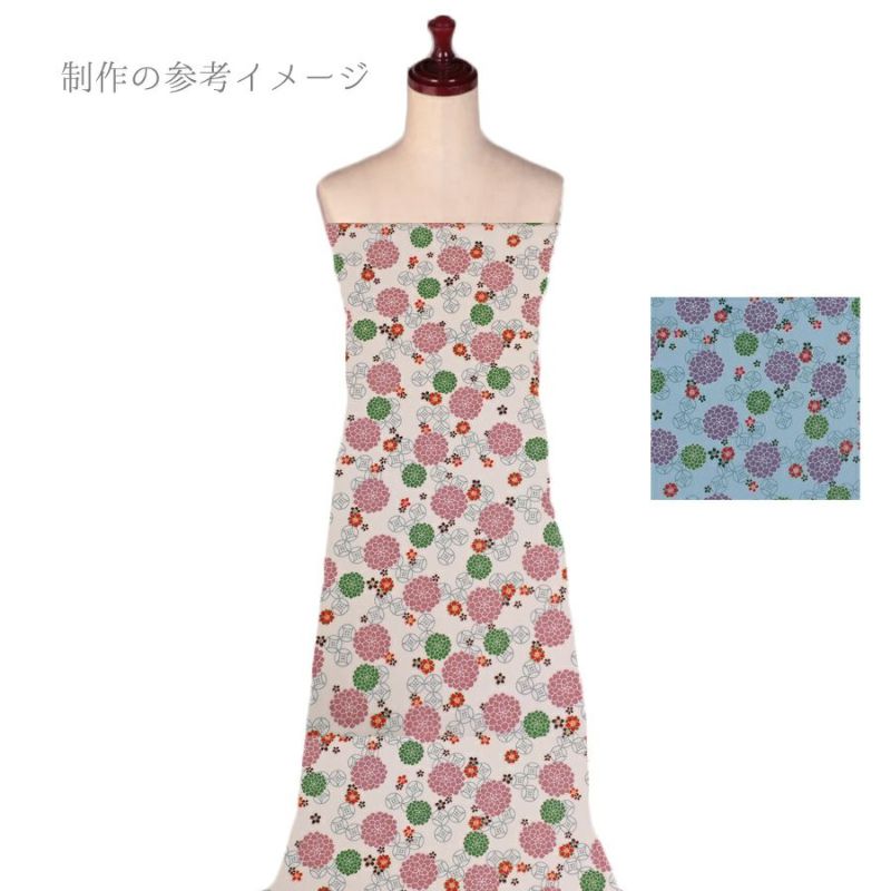 衣装にもおすすめ!洗濯OKのちりめん ポリちりめん生地 七宝に春秋花(水色) 10cm単位 切り売り