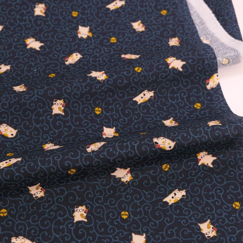 和風のかわいいネコ柄 和柄コットン生地 唐草にのんびり猫(紺色) 10cm単位 切り売り
