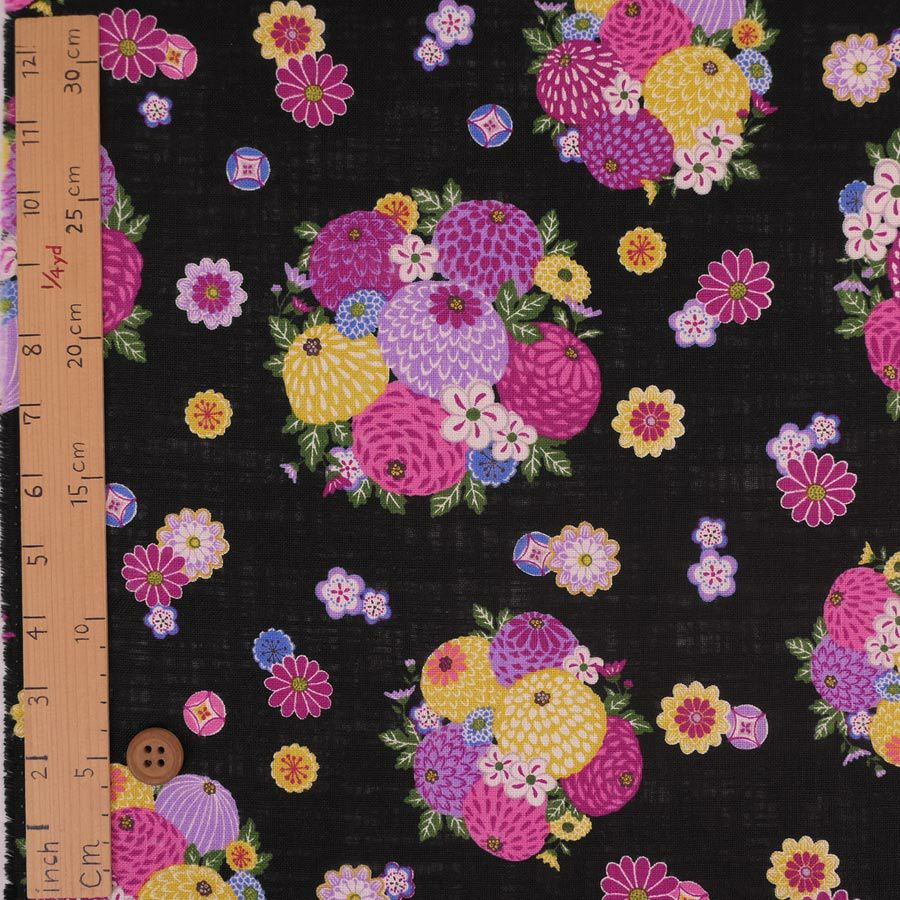 和柄コットン生地 手まり菊(黒) 10cm単位 切り売り
