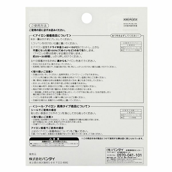 ○使用方法:ワッペンを付けたい場所に置き、当て布をしてアイロン(140~150度)を強く押し付けて下さい。長時間のご使用や洗濯頻度の高いものには縫い付けて下さい。