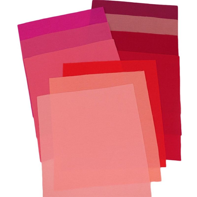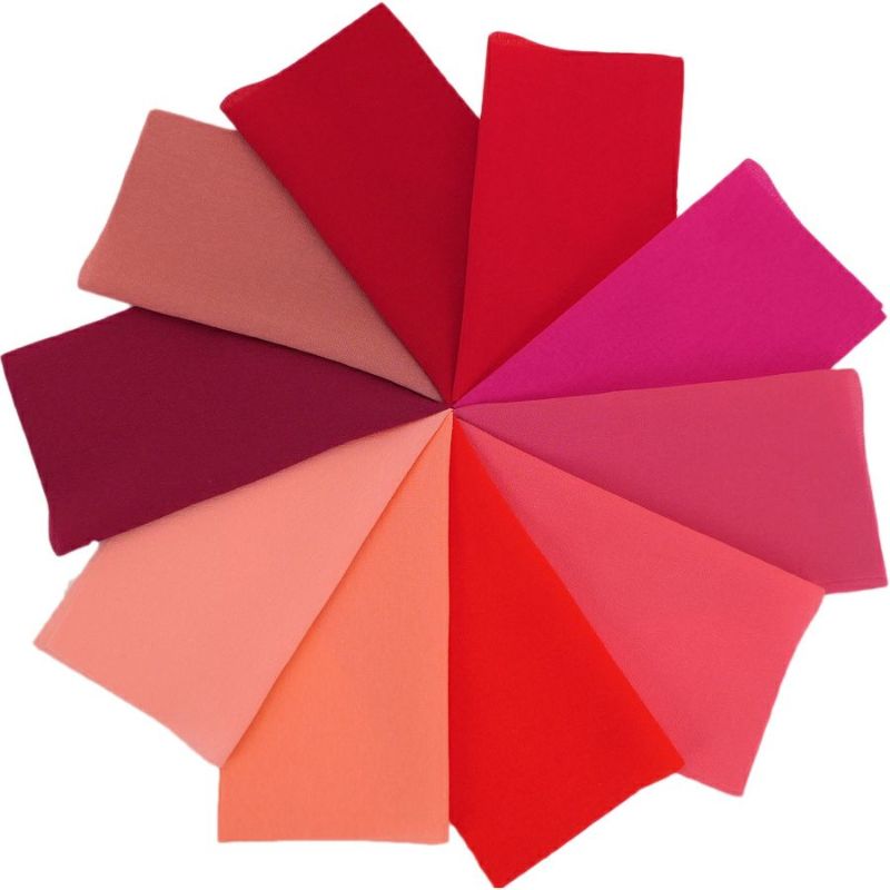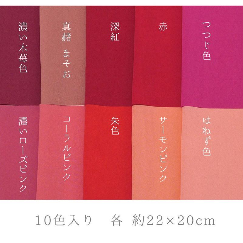 商品案内つまみ細工やちりめん手芸に便利!赤系とピンク系の無地一越ちりめんを10色セットで。