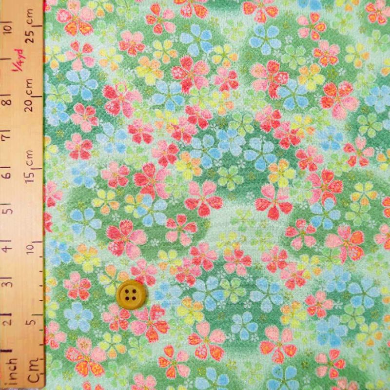 ●この黄緑は、背景が淡い黄緑で、そこにくすんだトーンの黄緑色のぼかし模様が入っています。桜の花は黄色、水色、グリーン、ピンクです。水彩調のほんわかとした優しい色合いがきれいです。