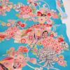 古布を再現した豪華な柄 レーヨンりんず 御所車に花扇(青) 10cm単位 切り売り