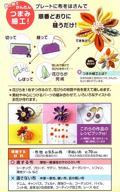 商品案内 プレートに布をはさんで順番どおりに縫うだけ!針と糸でかんたんつまみ細工をお楽しみください。6作品のレシピブック付きです♪